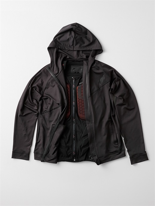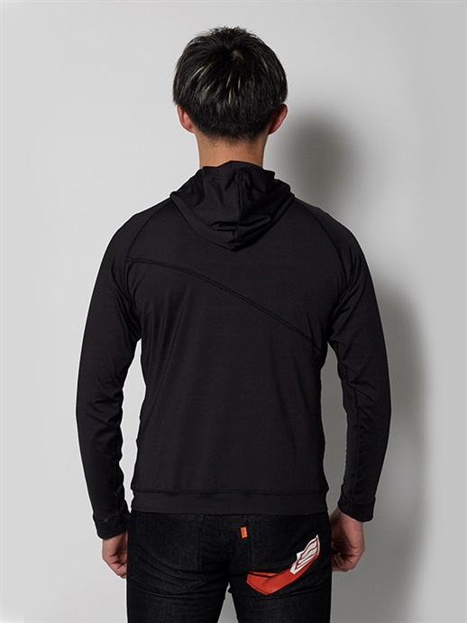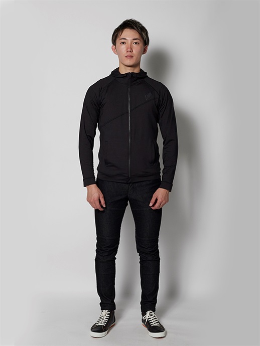 ゆるやかな“リラックスフィット”のサイズ設定と運動性にすぐれたパターンを採用しています。単体でも、ジャケットのインナーウエアとしても着られるモーターサイクル用ラッシュパーカです。