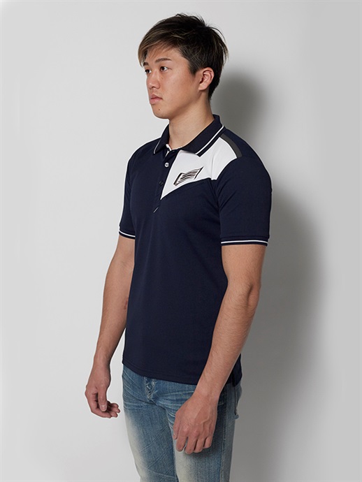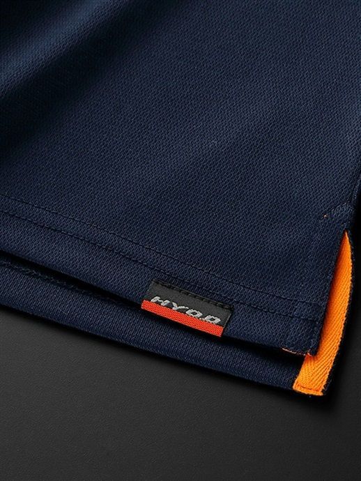 アシンメトリのショルダーデザイン、左胸の斜めポケットがアクセントになっています。襟や腕部分のコンビネーションラインが夏のさわやかさを演出します。ボタンにはHYDOロゴ入りです。