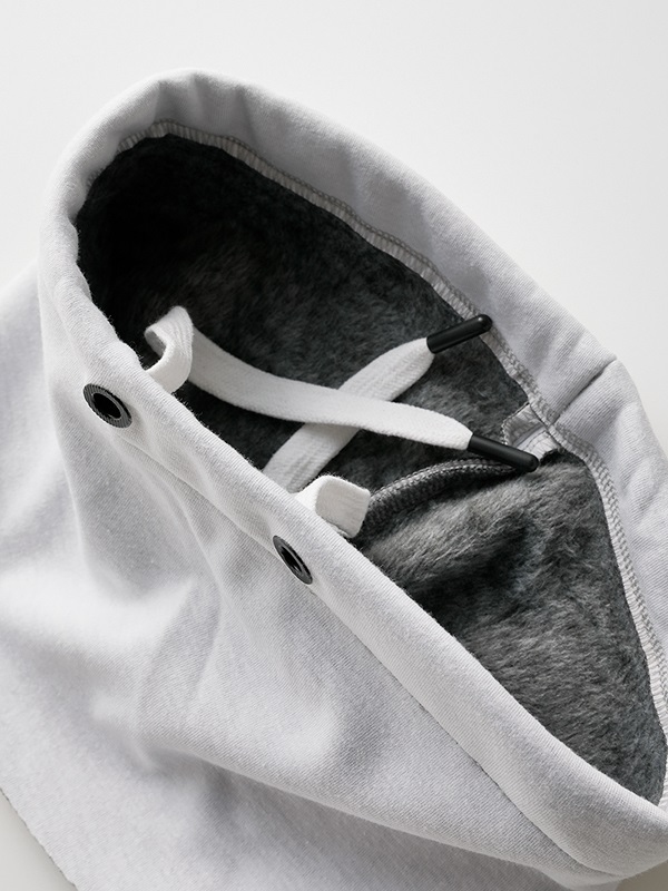 首まわりをすっぽりと覆うことのできるモックネック仕様のスウェットシャツです。首まわりのドローコードは、ネック内側のホールから首側に引き出せる仕様にしています。お好みに応じて使い分けすることができます。