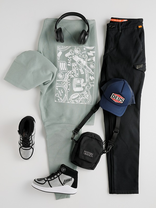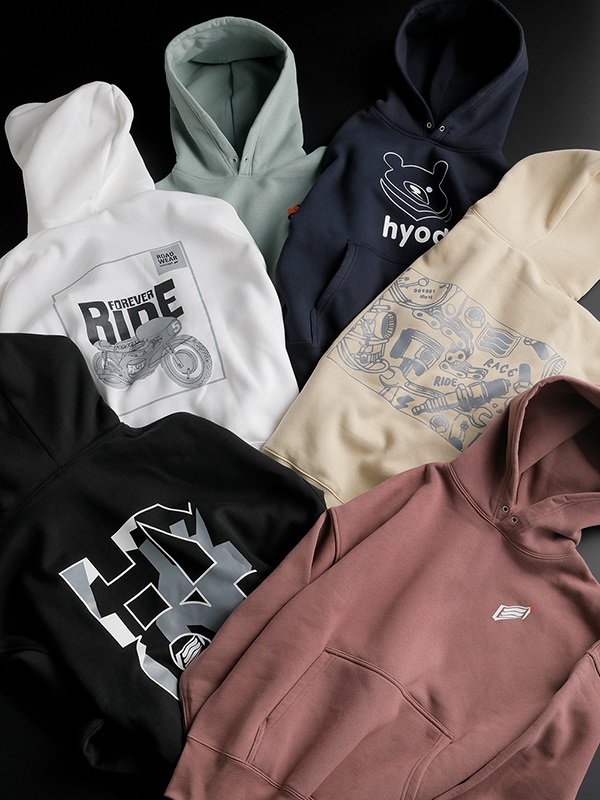 ゆったりシルエットと大きめフードのプルオーバーパーカ。バックプリントにはバイクのパーツとHYODロゴを背中いっぱいにワイドにレイアウトしています。左胸にはスクエアHYODのプリント入り。年齢を問わずに着用できるボディカラーとプリントカラーを組み合わせています。