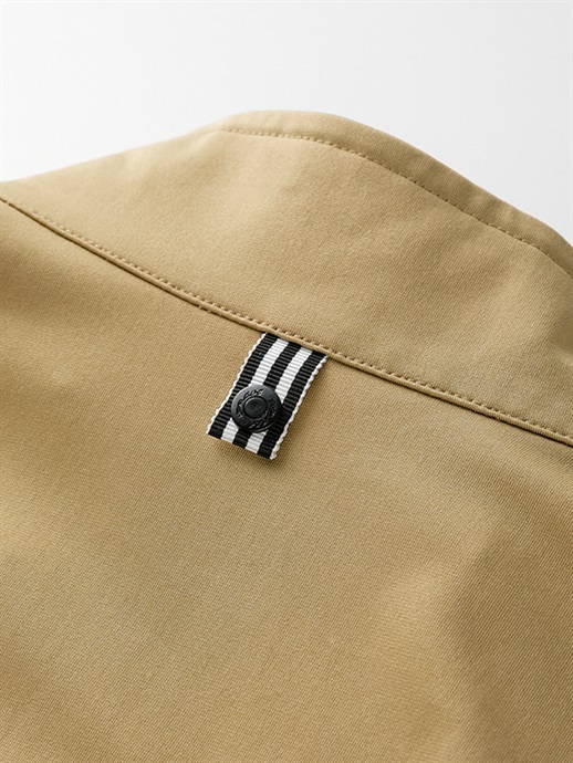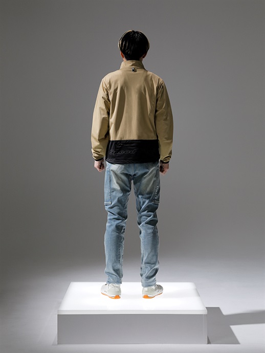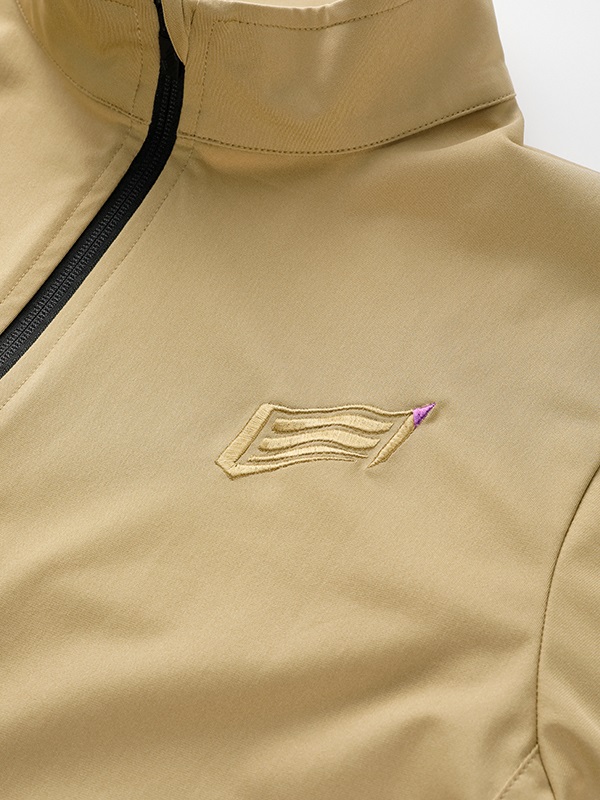 胸には上品にHYODクレストマークの刺繍を入れています。少し高めのスタンドカラーの襟元には、ファスナーガードも備え不快な首へのあたりを防いでいます。