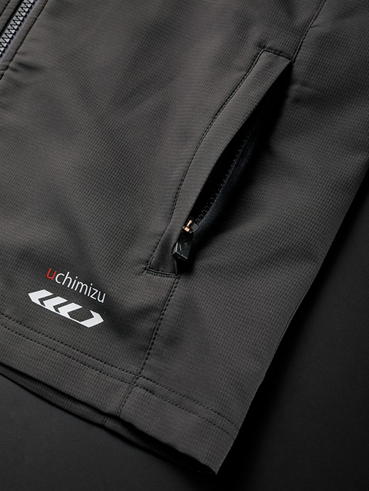 優れたストレッチ性と適度なUV性を兼ね備えた“UCHIMIZU”素材はサマーシーズンでも快適な着心地のハイテクマテリアルです。発生した汗を肌側の繊維が素早く吸収し、生地表面の気化促進繊維が蒸発を加速させることで、衣服内の熱を奪い温度を抑える効果があります。