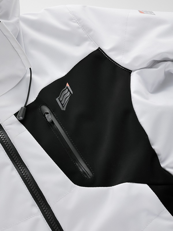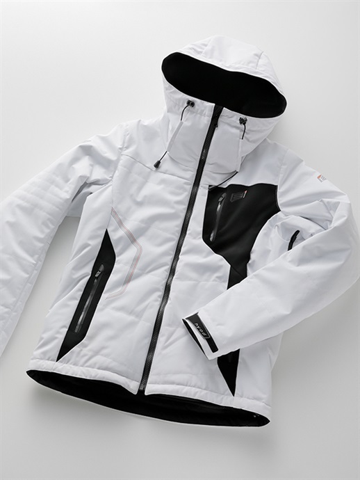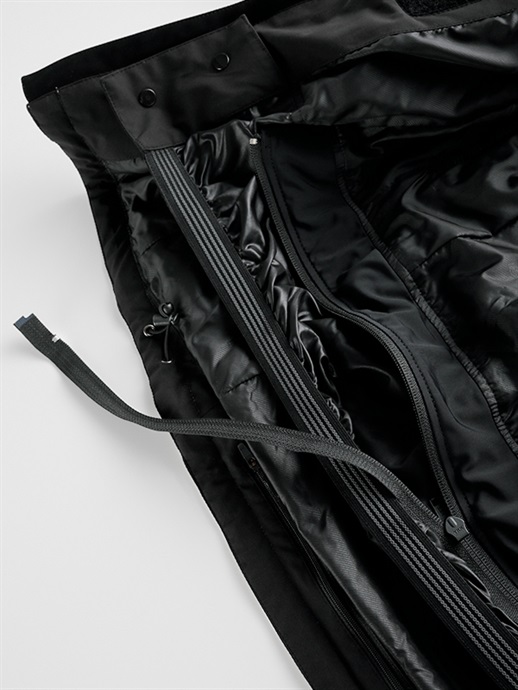 ジャケット裾部には裾からの寒風の浸入を防ぐストームガードを備えています。腹部でプラホックにて留めるもので、ストームガードの下部は伸縮性があり、滑り留めも施していますので、前傾姿勢でもまくり上がることがなく高い保温性を実現しました。