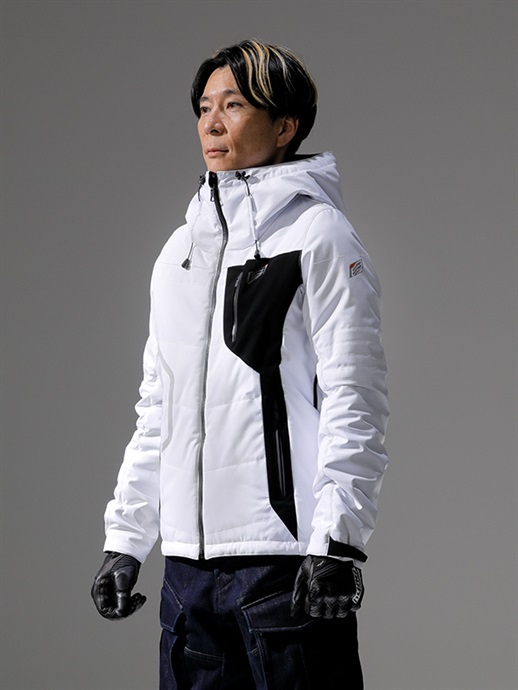 左胸はカードサイズが入るポケットを備えています。中綿入りで暖かく、軽くてしなやかな着心地が魅力のフーテッドウエアです。