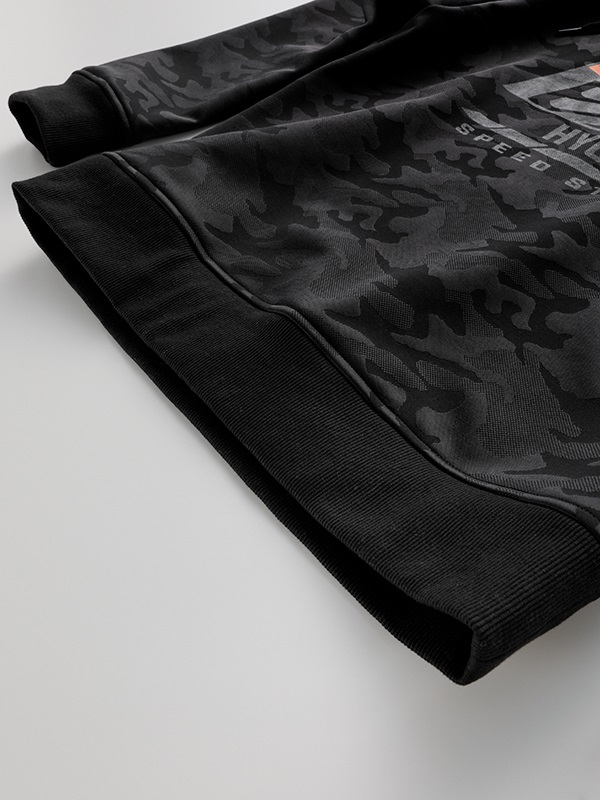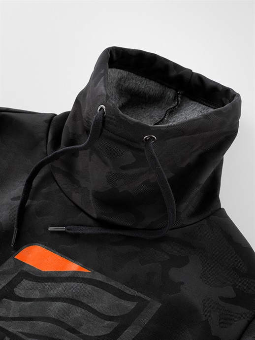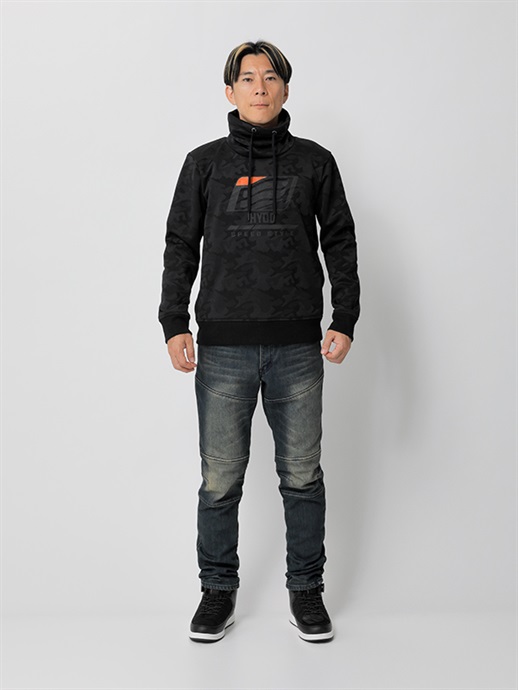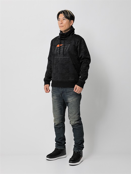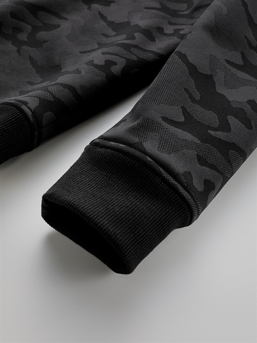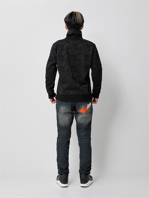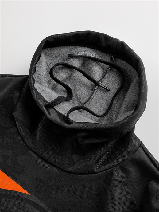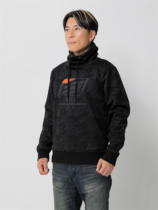防風、防寒に優れた3層構造の防風素材を使った、ハイネックスタイルのウインドブロックヒートアパレル。表生地には立体感のあるカモ柄はジャガード織りを採用。この表生地に防風フィルムをボンディングし、さらに柔らかさと肌触りにすぐれたシャギー素材を裏側に使って、抜群の保温性能を発揮しています。首まわりをすっぽりと覆うことのできるモックネック仕様で、首まわりのドローコードをネック内側のホールから引き出して着るなど、シーンや好みに応じて使い分けができます。寒さをシャットアウトし、カジュアルに冬を楽しむための一着。